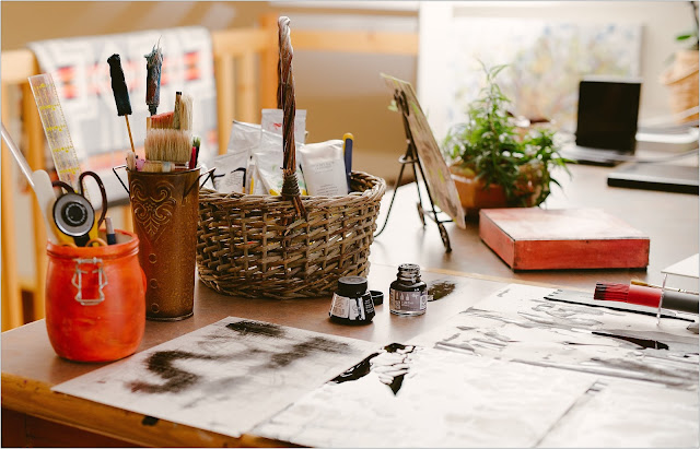 Kimmie (Elusive Muse [elusivemu.se] and graphic designer at the Riverton Printers, [branch of the Riverton Ranger Newspaper]) is a beautiful and fun lady I had the privilege of working with for a few months. She enjoys a wide variety of artsy things and has been keeping sharp with several online groups and classes with new techniques. She has a lovely studio (that has a gorgeous view of the mountains!) in which to create her ideas. In these photos, she is using Indian paint, watercolor, and graphic design; these are just a few of the many things she works with.